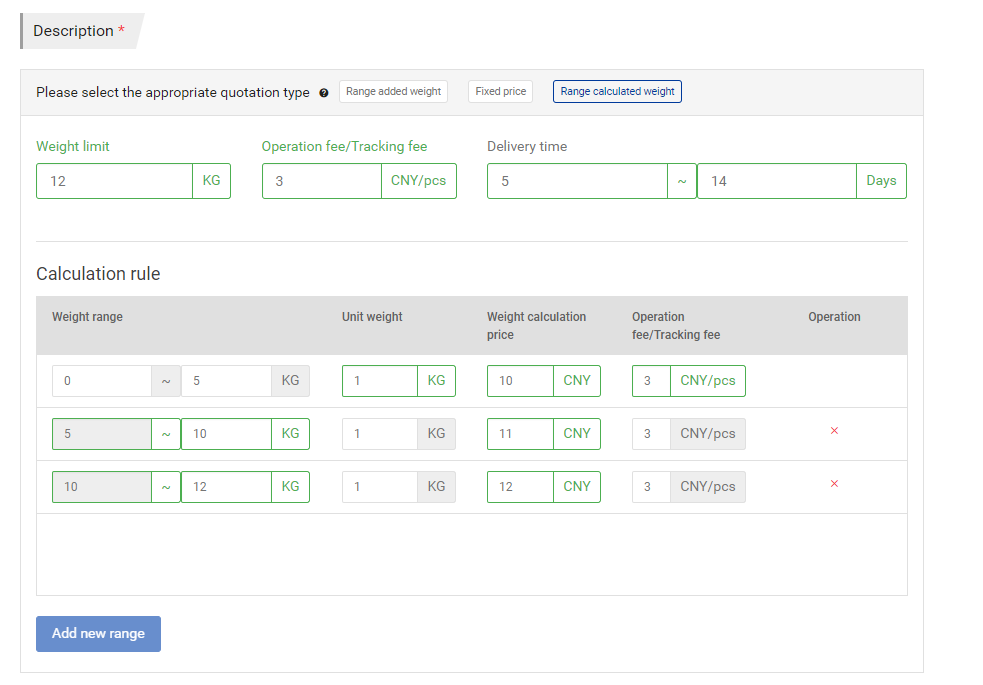 Take the above screenshot as an example, if a user enters 7.5KG, it belongs to the second range, then the gross freight would be 7.5/1*11 (the freight of the second range)+3 (operation fee)=85.5.