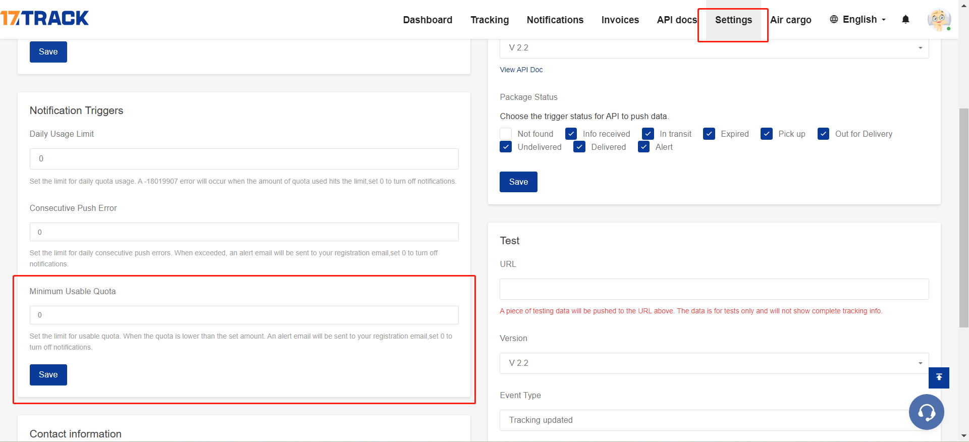 2. Click on the “Settings” to access the settings panel. In the “Minimum Usable Quota” section, set the threshold value. When the available quota drops below this threshold, an email notification will be triggered.