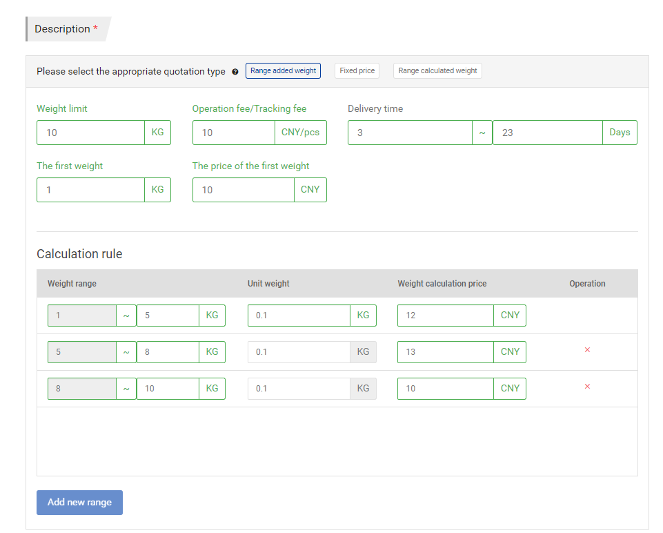 El rango de peso agregado se refiere a los paquetes con el primer peso y el precio del primer peso (por supuesto, ambos pueden ser 0). Tenga en cuenta que aquí el precio se calcula sumando cada precio de rango. El algoritmo es como sigue: