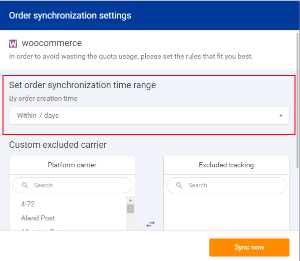 Para evitar consumir sua cota de rastreamento de pedidos concluídos há muito tempo, você pode escolher o número de dias que deseja sincronizar na sua loja por data de criação do pedido.