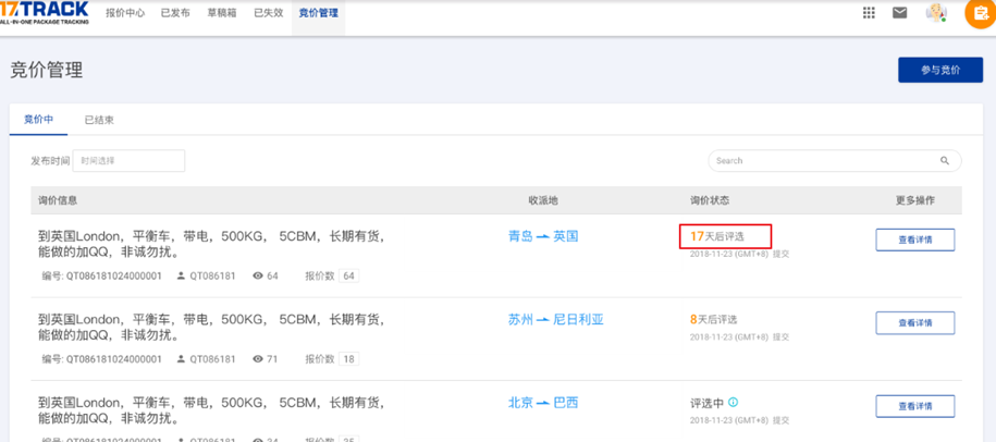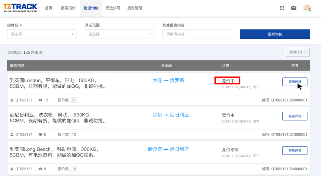 - 注册登录运输商后台后,通过物流询价页面可以查看询价单。在询价单列表中,每一条询价信息都会展示对应的状态。选择状态为“竞价中”的询价单,点击查看详情来参与竞价。