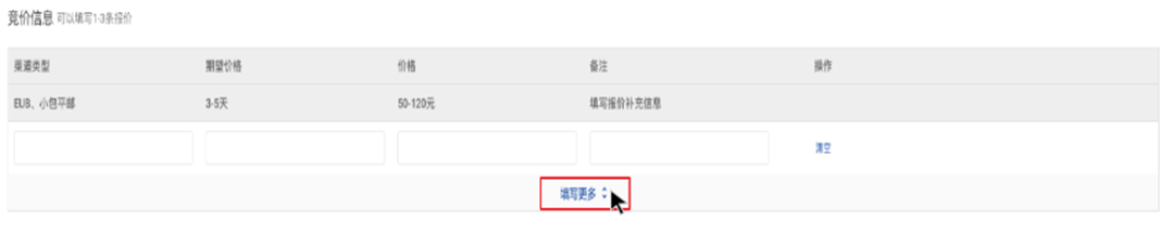 - 每一份询价单可以填写1-3条报价,点击填写更多,展开后可以继续新增报价。